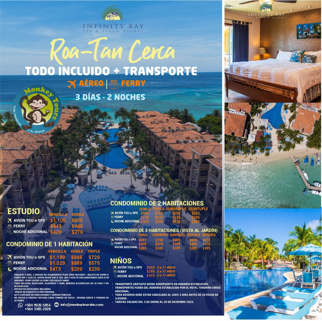 - Tour en cortesía en Lancha para ver los Manglares, visita a los Delfines y hacer snorkel en el arrecife de coral de Roatán